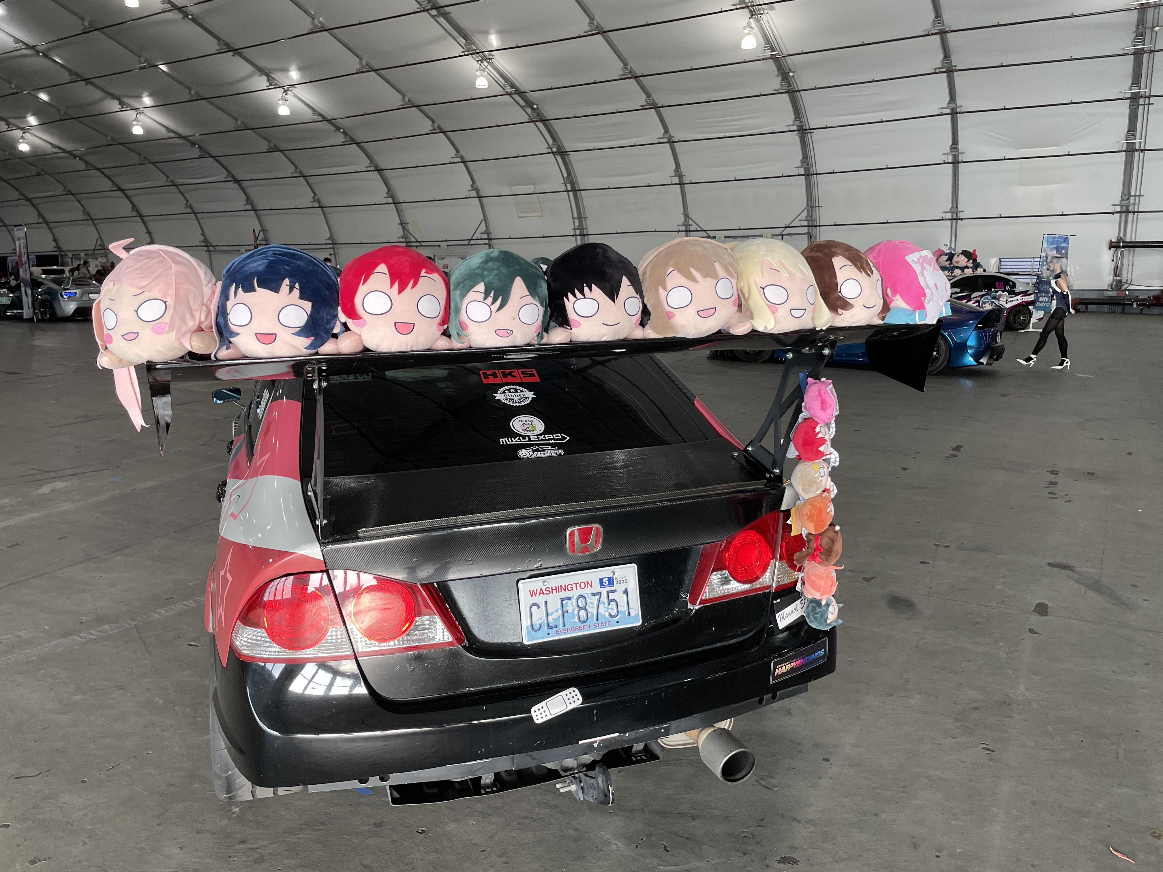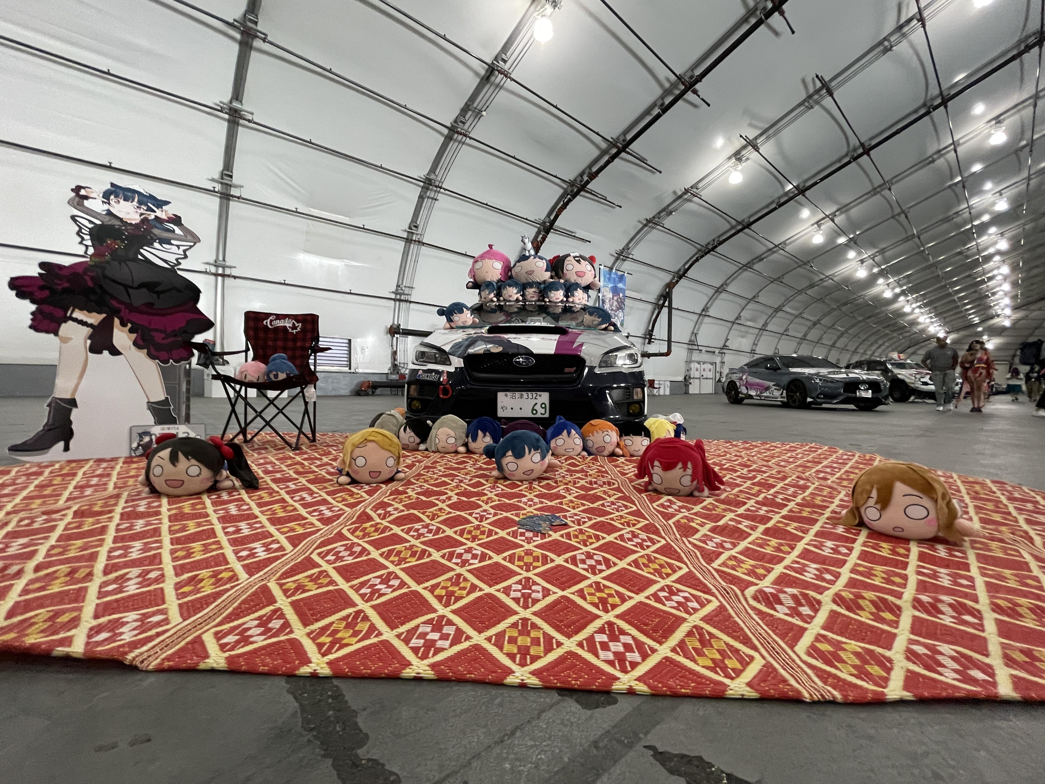 我拍了挺多车的。有一个阿库娅的,车牌是「UWU 86」。有个更衣人偶的,连里面都充满了二次元气息。有两台LL的痛车,一个摆了一圈趴趴,另一个在尾翼上摆了一排趴趴。有一辆長瀞的兔女郎,我挺喜欢的。还有一辆毫不起眼的86,上面写着藤原豆腐店,摆在场地的最深处。